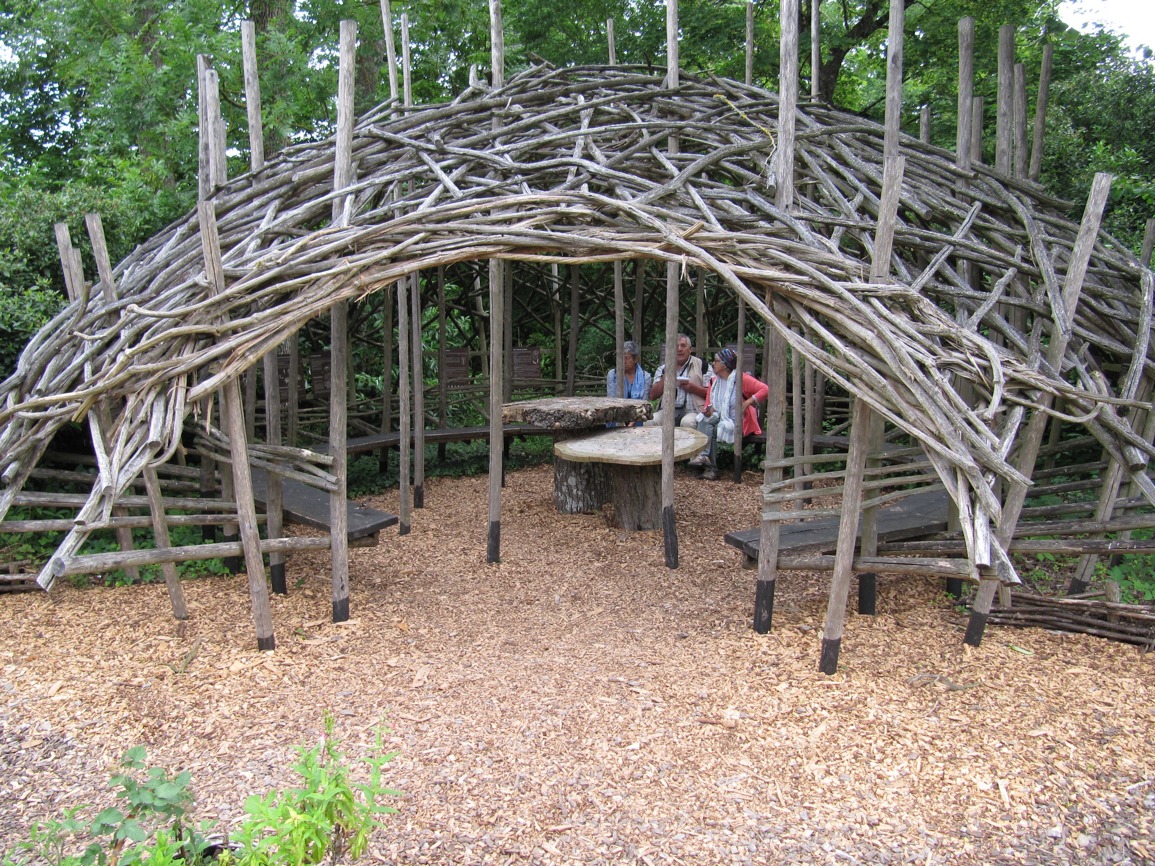 Els “nius”, petits capolls teixits amb vímet, donen la benvinguda als infants per un moment de descans, escolta o observació. La cabina gran, trenada amb branques de castanyer, ofereix una zona de lectura i d’intercanvis.