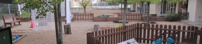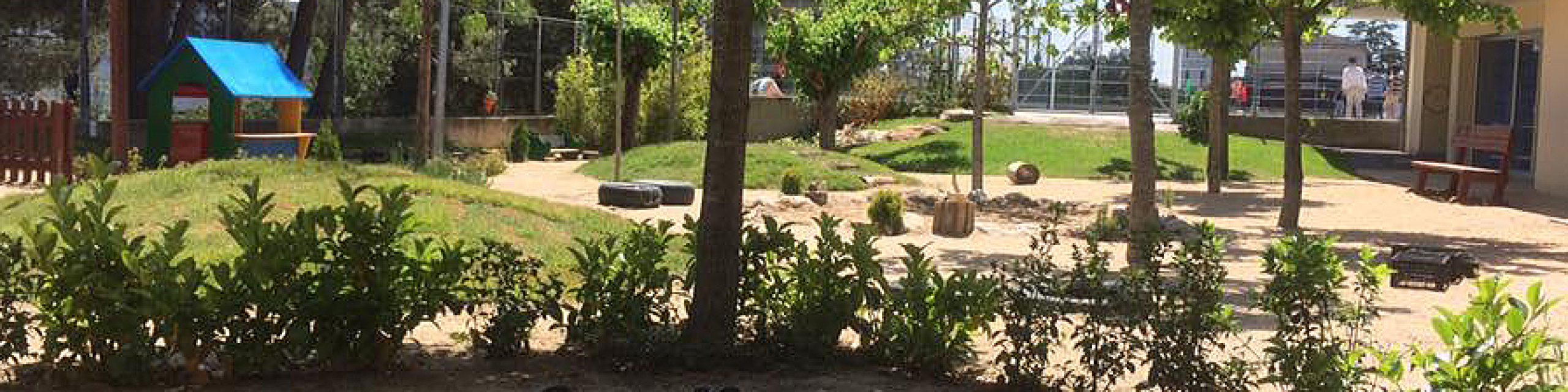 Una primera fase d’actuació: s’ha suprimit la tanca central que dividia el pati en dues parts. Davant la passarel·la que hi ha davant del pati de l’escola primària s’ha generat un petita plataforma encerclada per un desnivell cobert d’herba. S’han creat dues muntanyetes també cobertes d’herba. S’ha creat un sorral encerclat per grans troncs verticals i còdols. La zona de la sortida de les estances dels nadons s’ha delimitat amb arbustos. En aquesta primera fase queda planificat l’espai, un dibuix que convida a anar fent i observant els infants i que amb el seu manteniment aniran fent créixer.