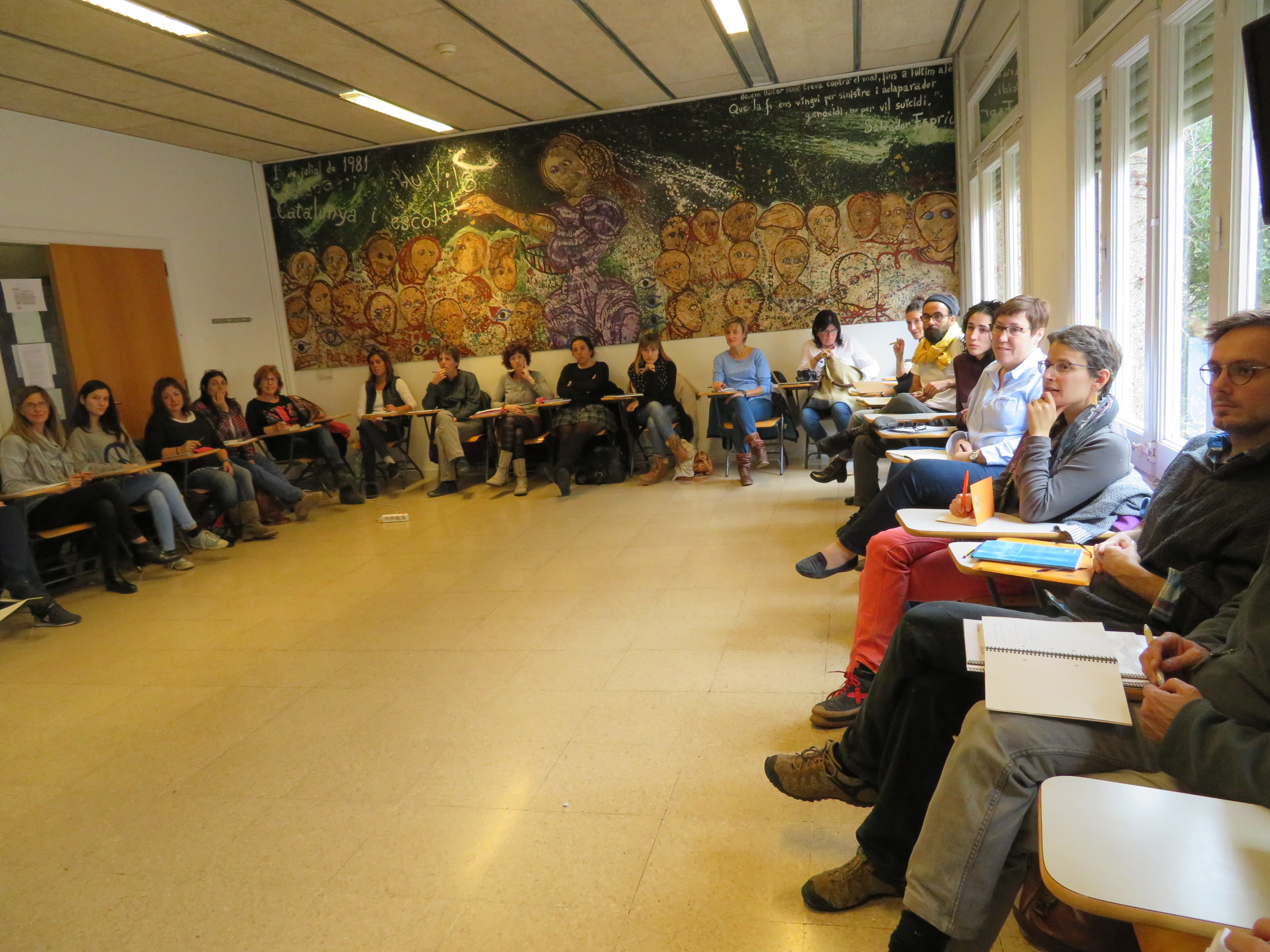 El fet de trobar-nos representants d’una gran diversitat de professions i de territoris ens ha permès disposar i compartir diferents sabers per fer possible la presa de consciència de la complexitat dels temes que anàvem aprofundint. Trobant camins, recursos, intercanvis i moltes preguntes sobre els reptes dels espais dins, fora, com espais útils, sostenibles, pràctics, amb criteris educatius.